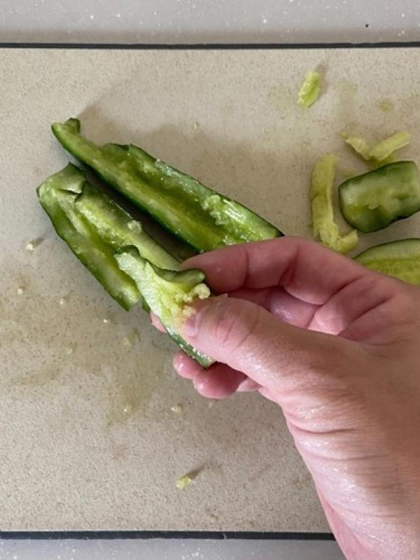 きゅうりをちぎるときに種を取り除けば、時間がたっても水っぽくならずに召し上がっていただけます。