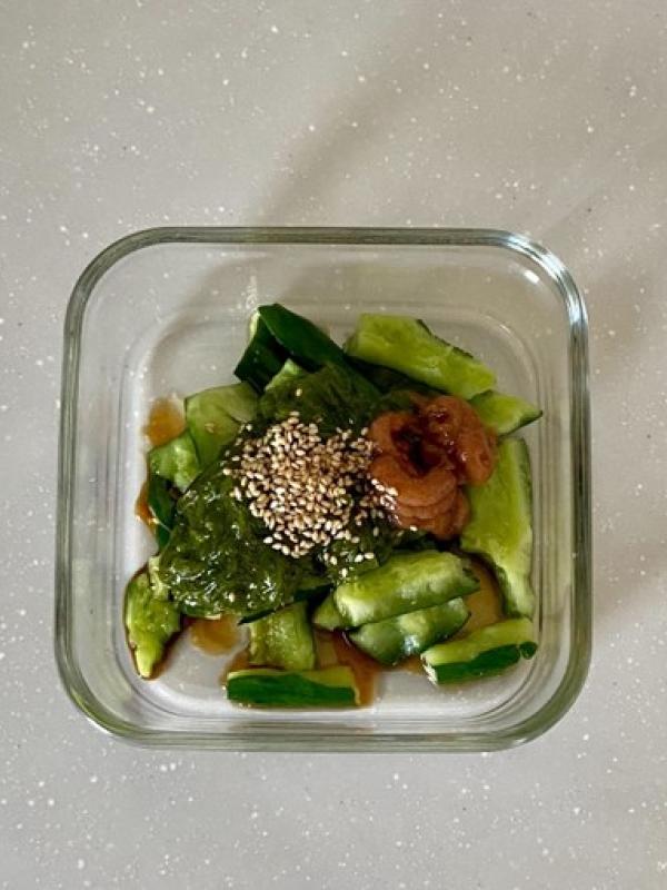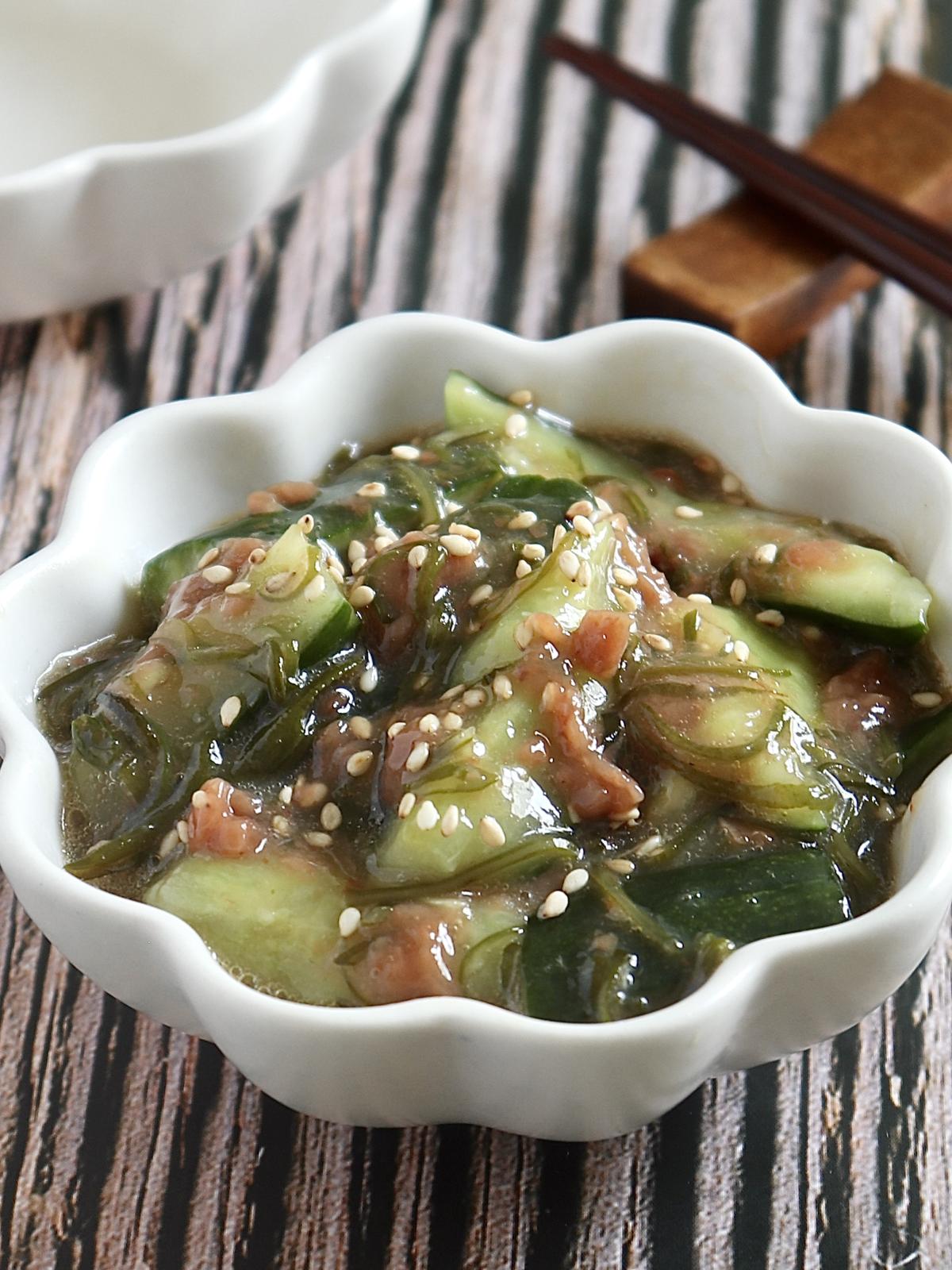 ポリポリとしたきゅうりの食感に、梅肉の酸味とめかぶが絡んで、さっぱりとした一品に。