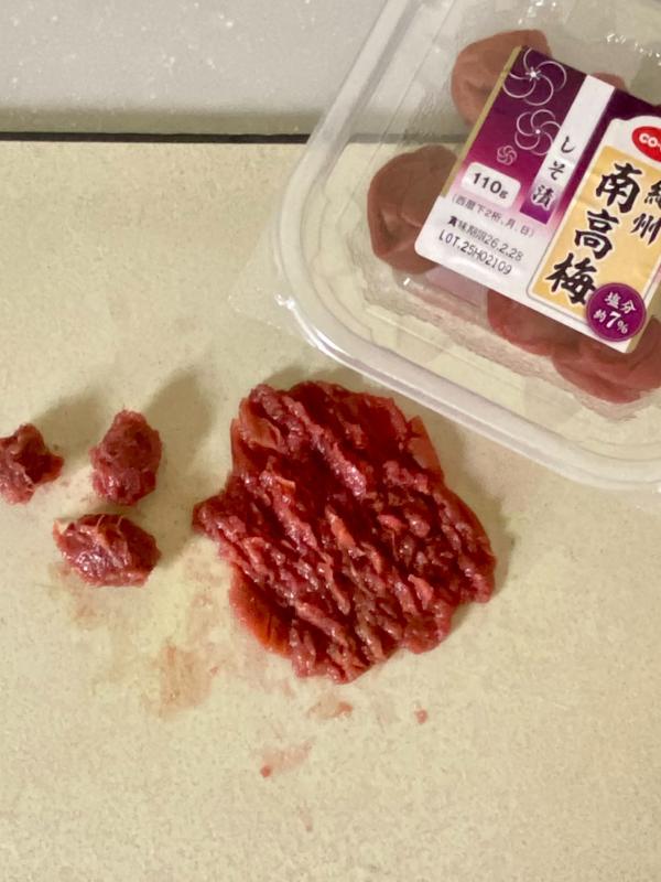 梅干しは種を取り除いて包丁で叩いてペースト状にする。