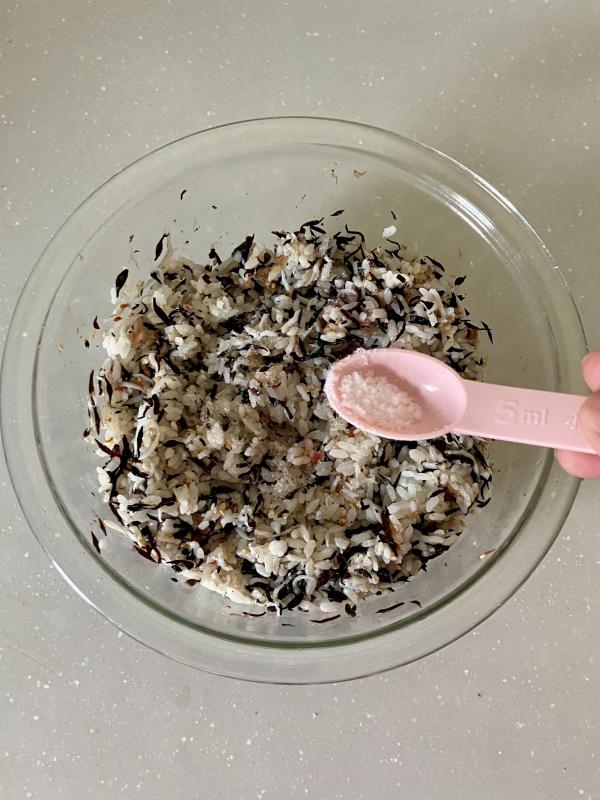 ボウルに白ご飯、しっかり水気を切った1のひじき、2の梅肉(種も)、ふっくらしらす干し、【A】を入れて混ぜ合わせ、塩で味を整える。