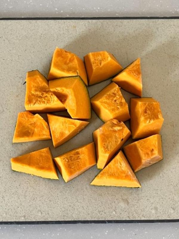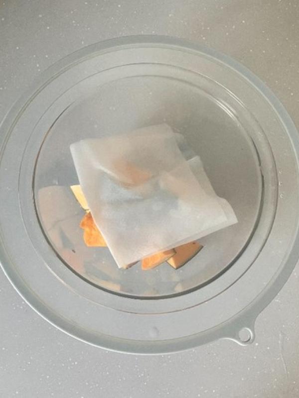 1かぼちゃは一口大に切り、耐熱ボウルに入れて濡れたペーパータオルを被せ、ふんわりとラップをし、レンジ600wで5分加熱する。
