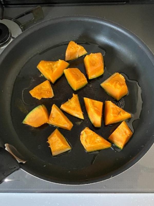 フライパンにサラダ油を入れて①のかぼちゃを入れ、焼き色がつくまで焼く。