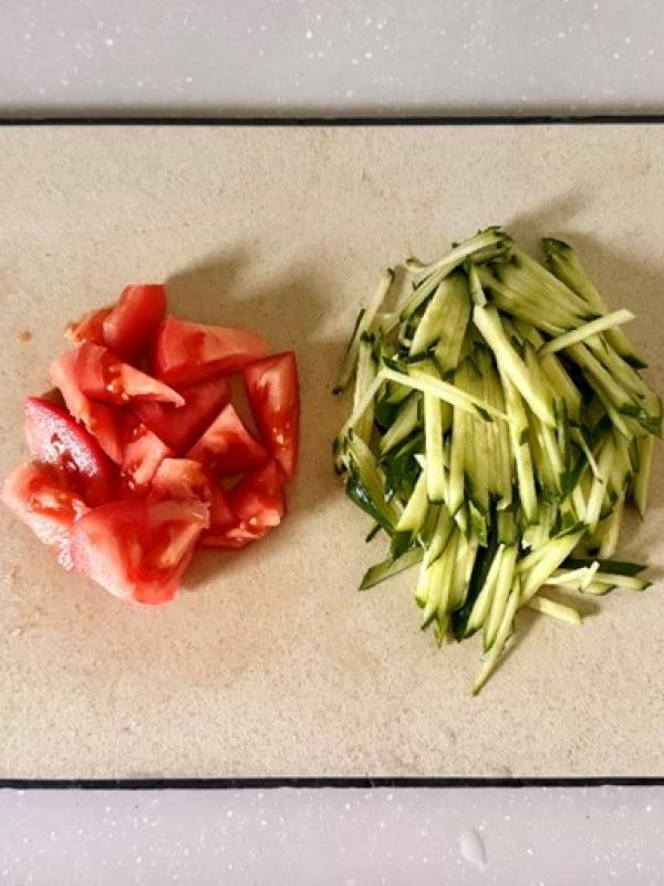 1きゅうりは千切りにし、トマトは乱切りにする。