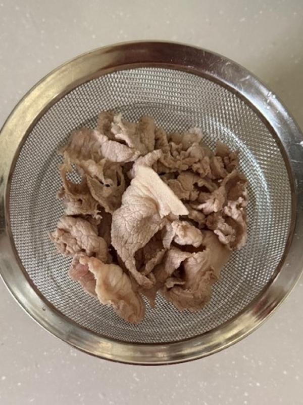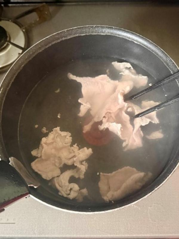 別の鍋にお湯を沸かし、沸騰したら火を弱めて豚薄切り肉をほぐしながらゆでる。肉の色が変わったら取り出し、常温で冷ます。
