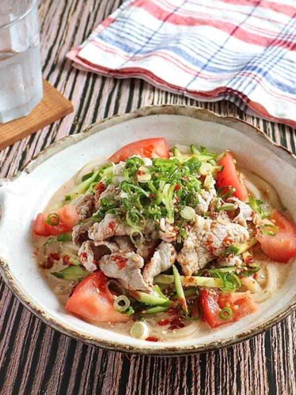 豚薄切り肉は弱火でゆっくり茹でて常温で冷ますと、しっとり柔らかく仕上がります。うどんは氷水でしっかり締めると、