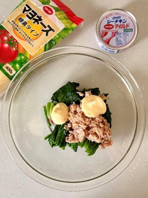 ボウルにほうれん草、軽く油を切ったシーチキンマイルド、【A】を入れて和える。
