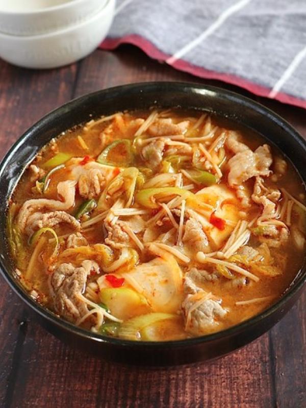 1キムチと豚薄切り肉は食べやすい大きさに切る。えのきは根元をほぐし、根元を切り落として3等分に切る。長ねぎは1cm幅の斜め切りにする。