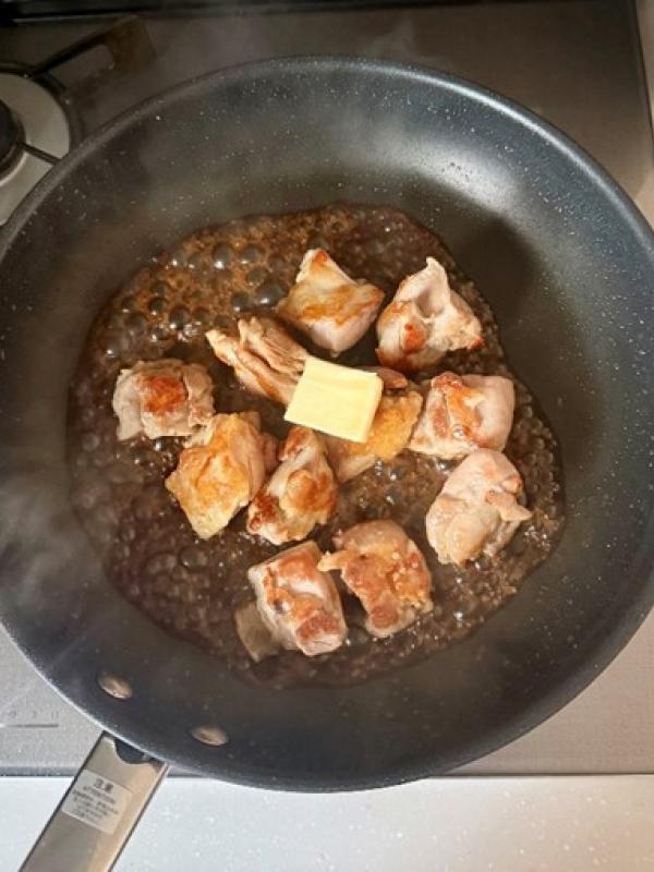 フライパンを中火にかけ、皮目を下にして鶏もも肉を並べて焼く。焼き色がついたら裏返し、火が通るまで焼く。