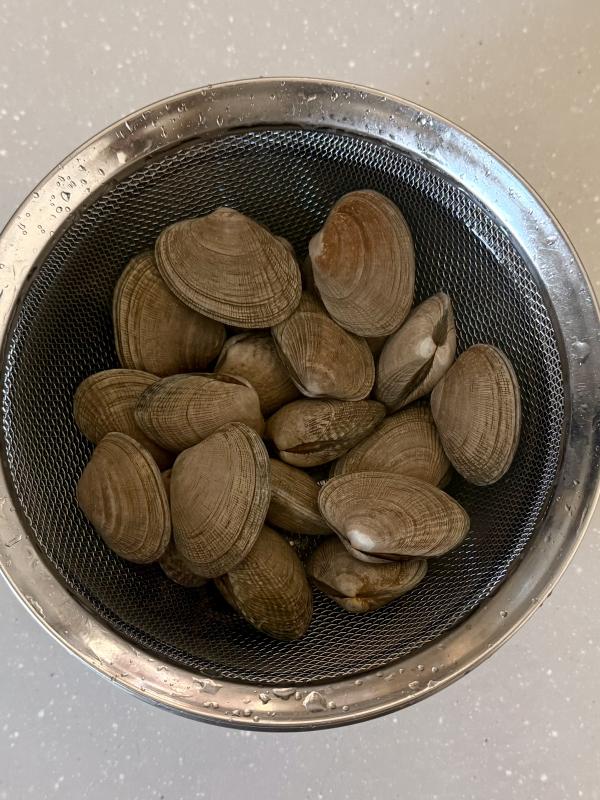 150度前後のお湯にあさりを5分から10分ほど浸し、最後にお湯を捨てて真水で殻同士をこすり洗いする。