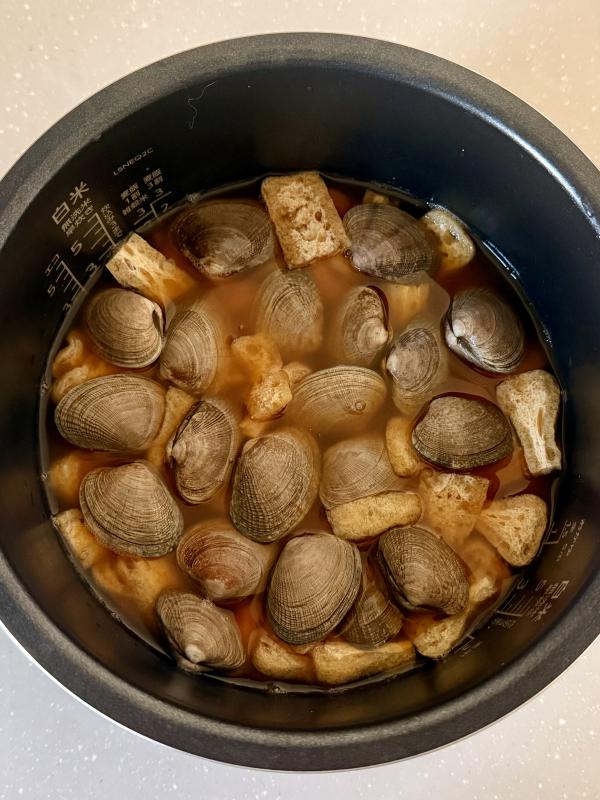 油揚げを入れて軽く混ぜ、あさりを殻付きのまま上にのせる。