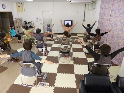 みんなで、いきいき百歳体操で体を動かした後に、脳活やゲーム、健康チェックなどで交流して楽しんでいます。
