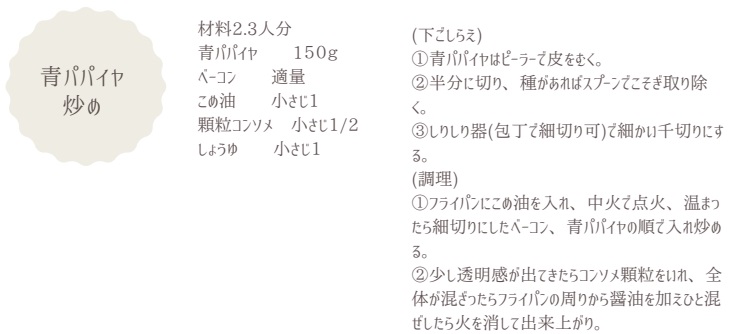 南国の野菜としてイメージしていた青パパイヤが、滋賀県内で”びわこ青パパイヤ”として栽培されていることを、JAレーク滋賀のイベントで知り興味を持ち、地域委員会でも学習会を企画しました。青パパイヤの栄養価・調理方法を学び、美味しさを知っていただきたいです。
