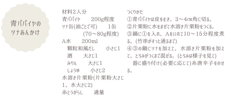 ③煮て食べる 「青パパイヤのツナあんかけ」(乱切り・角切りで。肉や魚と一緒にすると酵素の働きで肉が柔らかくなり美味)
