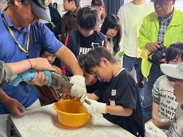 また、漁協組合の方に教えていただきながら、ビワマスの採卵体験も行いました。