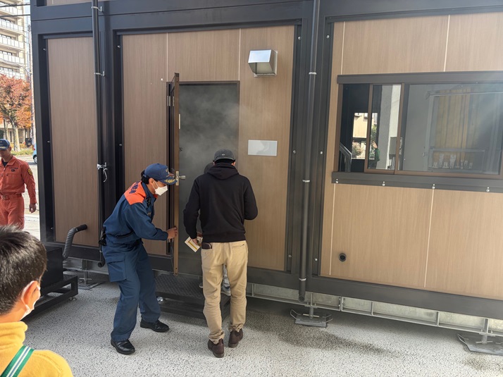 - 煙体験…煙が充満した部屋に入り、周りが見えない中、壁伝いに部屋を一周しました。しんどくならないように、煙はバニラの匂いになっていました。