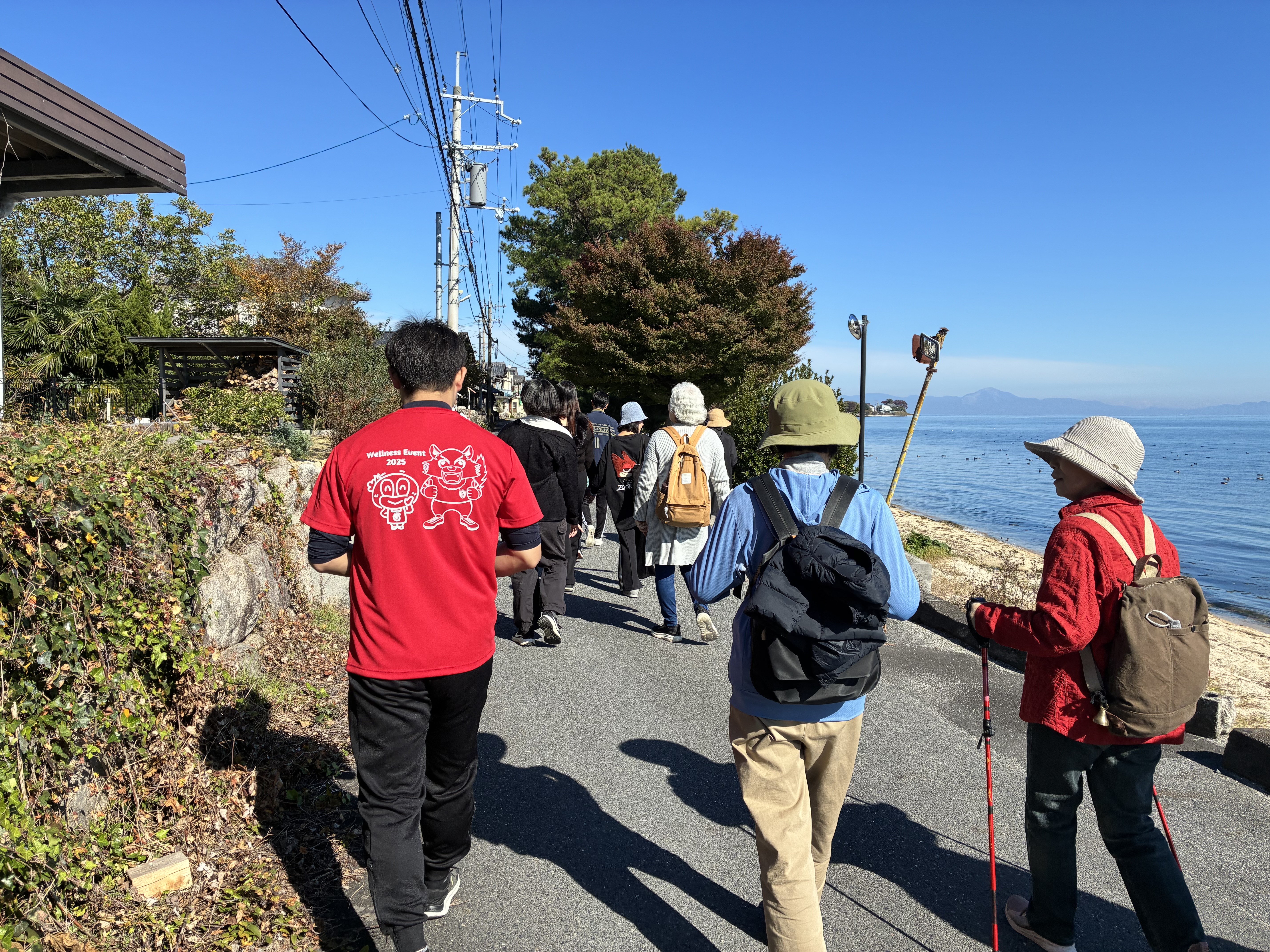11月16日(日)びわこ成蹊スポーツ大学(大津市北比良)で、「楽しく歩こう!健康ウォーク」を開催しました。会場には184名の参加者が集まり、晴天の中、びわ湖と比良山の景色を楽しみ、びわこ成蹊スポーツ大学の学生たちと交流しながらイキイキとウォーキングを行いました。