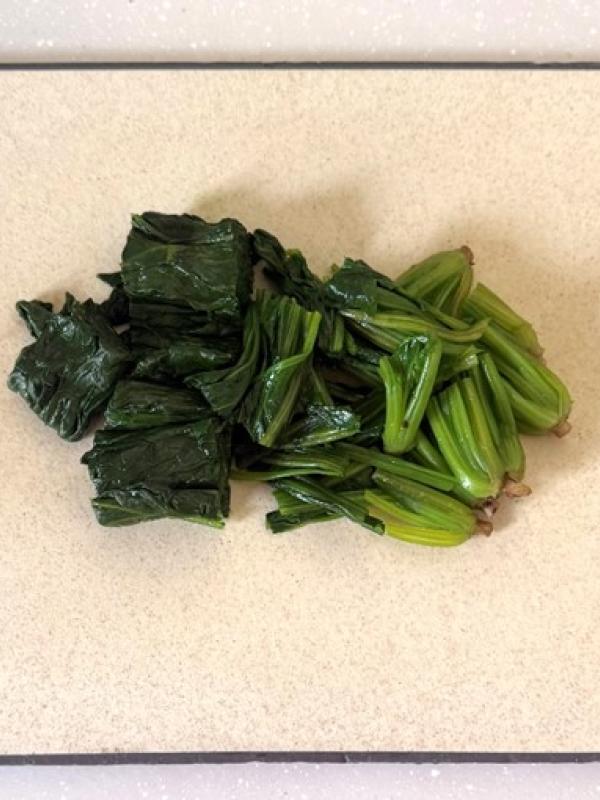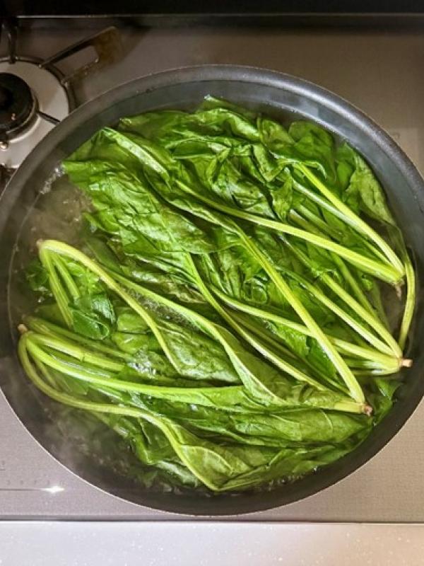 1ほうれん草は熱湯でさっと茹でて湯切りし、粗熱が取れたら水気をしっかり絞って5㎝幅に切る。