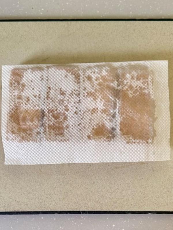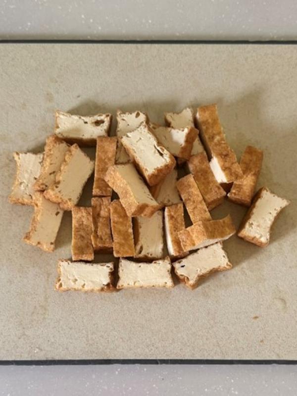 厚揚げはペーパータオルで油を拭き取り、1㎝弱の厚みに切る。
