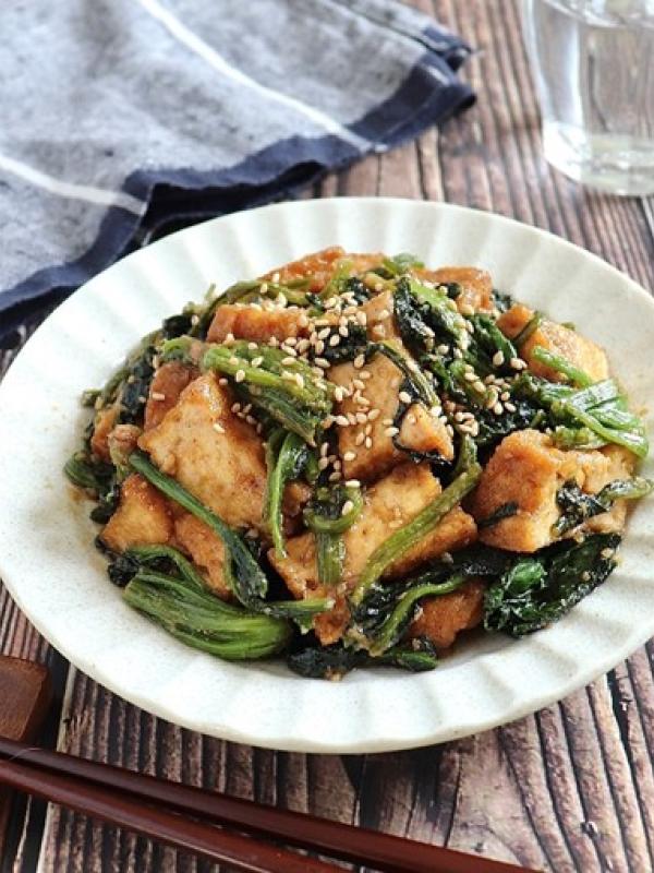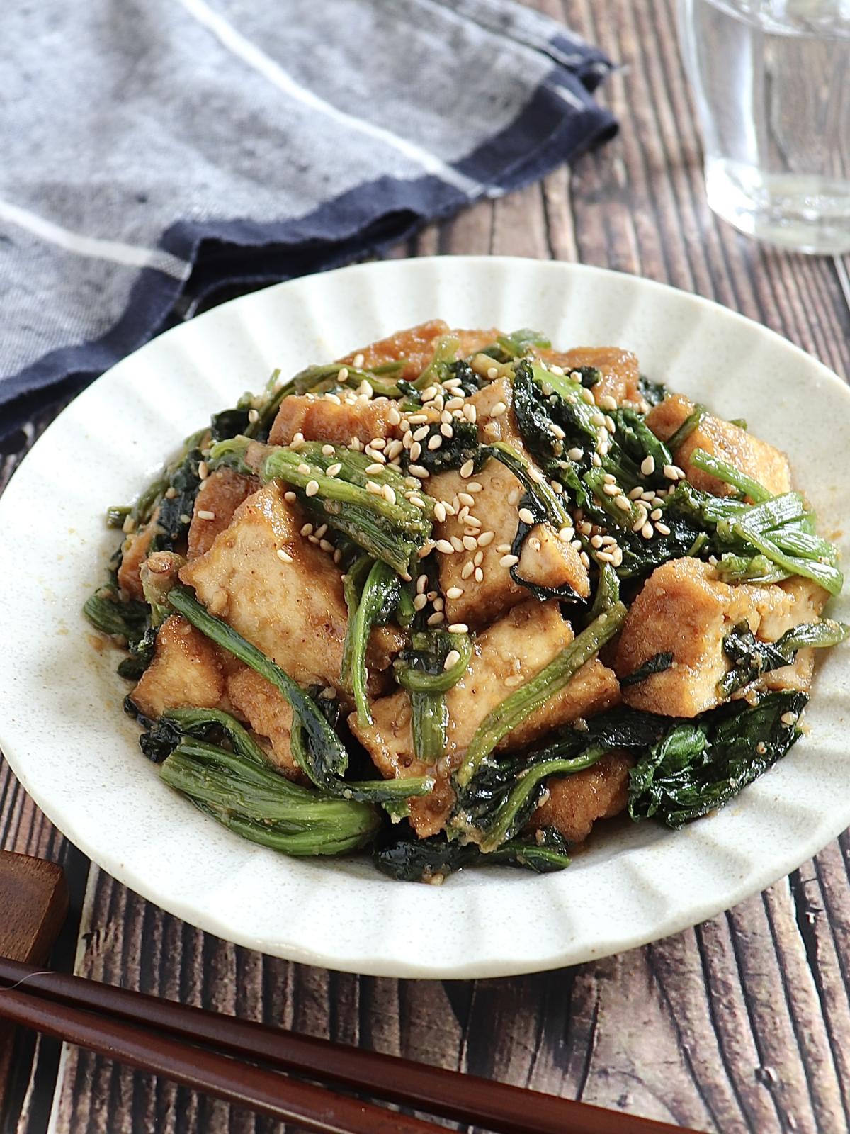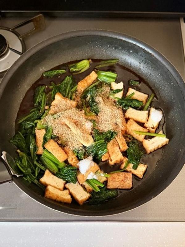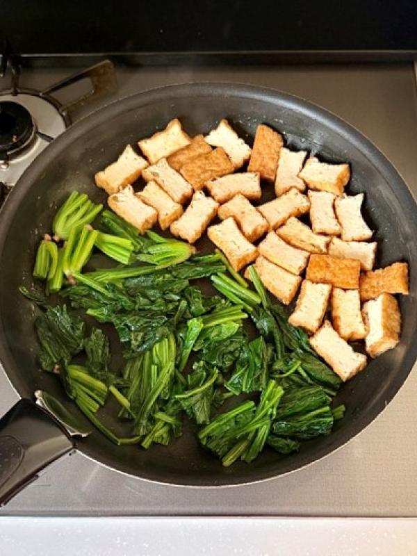 フライパンにごま油を入れて中火にかけ、厚揚げをカリッとなるまで焼き、ほうれん草を加えてさっと炒める。