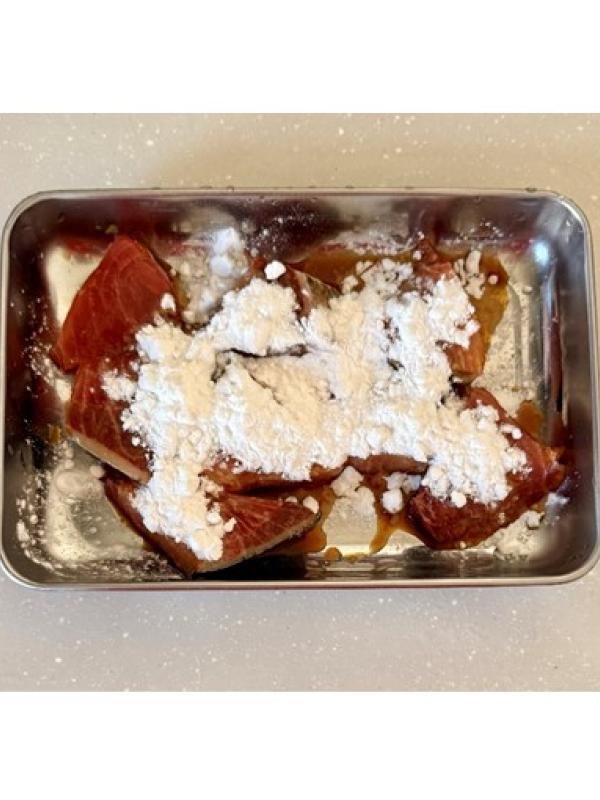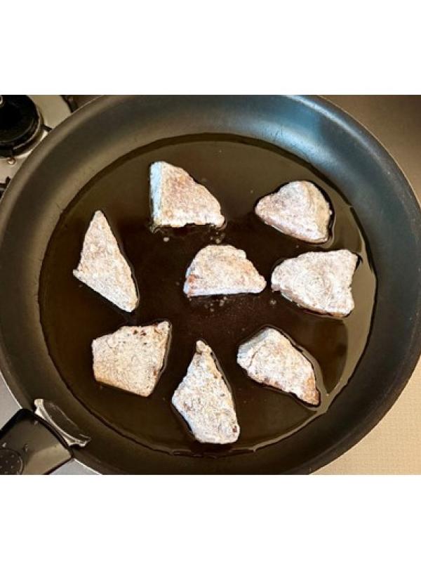 漬け汁を軽く切って、片栗粉をまんべんなくまぶす。
