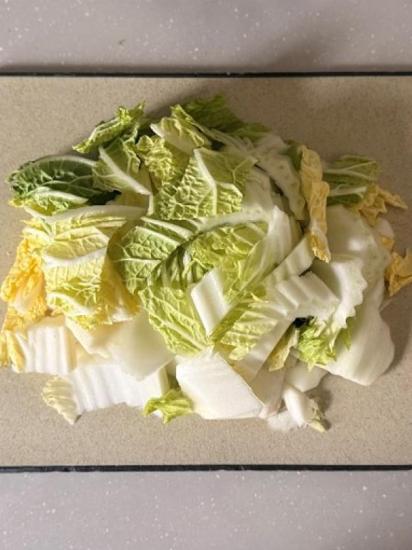 1白菜は芯の部分は1.5cm幅に切り、葉の部分はざく切りにする。