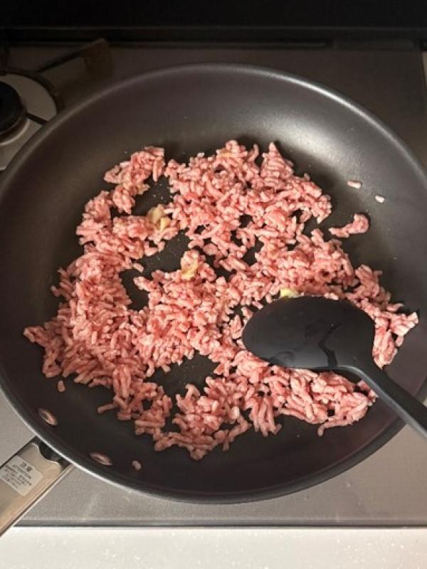 フライパンに豚ミンチと生姜チューブを入れて中火で炒め合わせる。