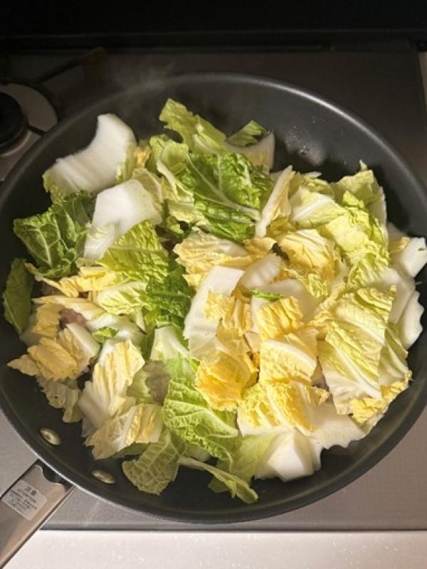 豚ミンチの色が変わったら白菜を入れて炒める。