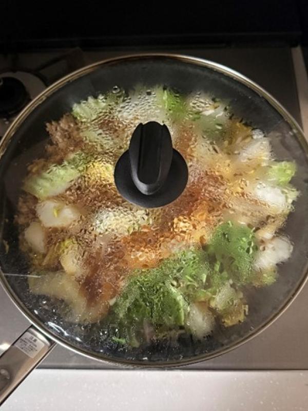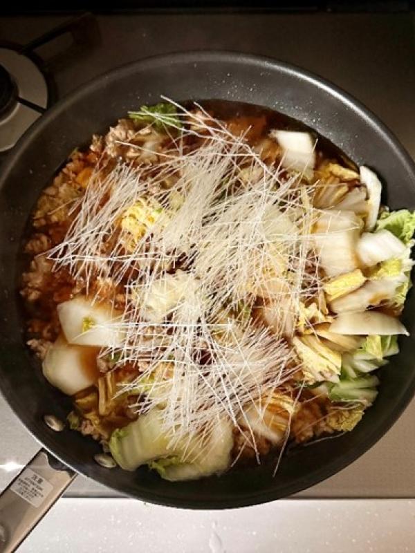 白菜がシナっとなったら、【A】を入れ煮立たせ、春雨を半分にカットして加え、蓋をして3分煮る。