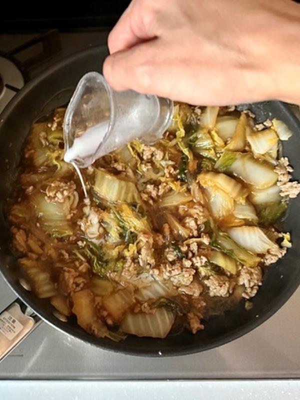 《ポイント》豚ミンチの脂身が少ない場合は、サラダ油を入れてから炒めてください。とろみがダマにならないように火を弱めてから回し入れてください。