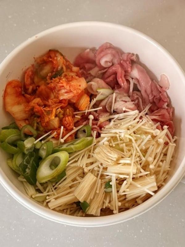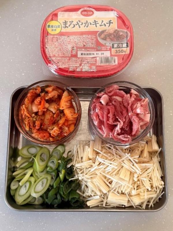 1キムチと豚薄切り肉は食べやすい大きさに切る。えのきは根元をほぐし、根元を切り落として3等分に切る。長ねぎは1cm幅の斜め切りにする。