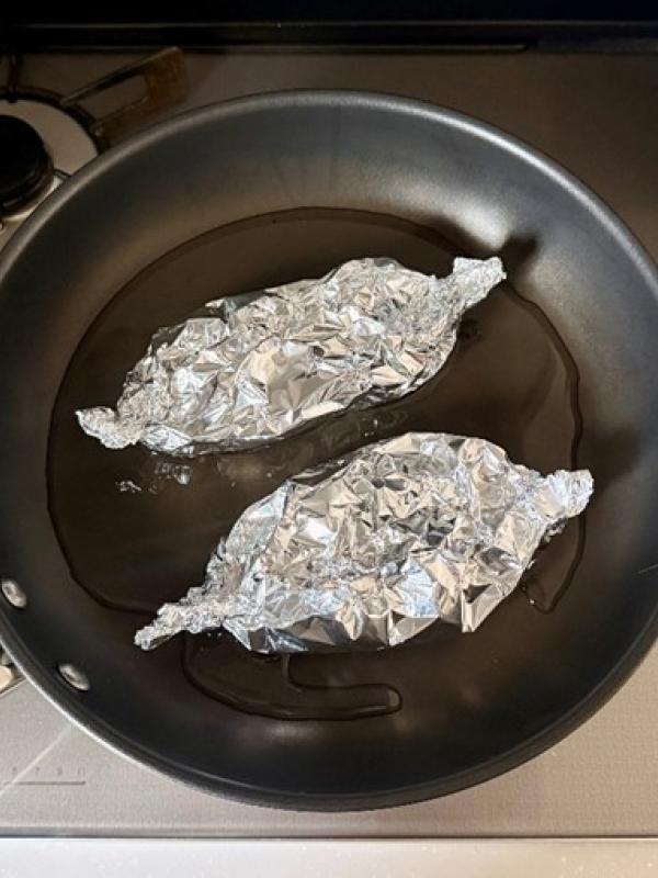 鮭の切身の上に②を等分に乗せ、アルミホイルの口を閉じる。