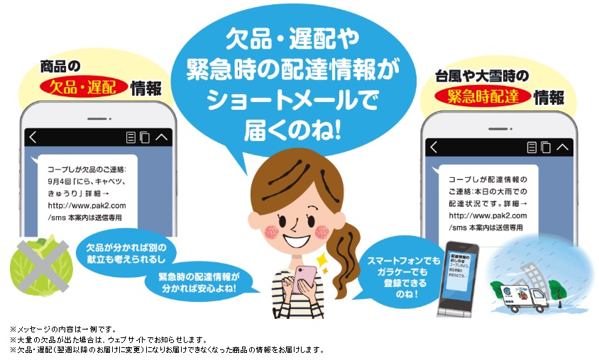 宅配でご注文いただいた商品の欠品・遅配情報や災害などによる緊急時の配送情報は、『お知らせショートメールサービス』でお知らせしています。