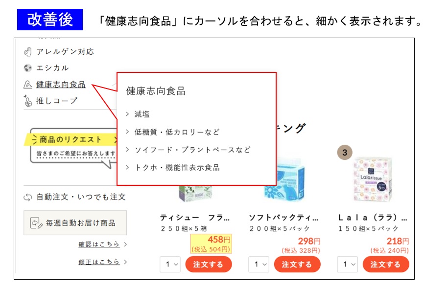 2025年1月27日から、eフレンズ(パソコン版)では、「健康志向食品」のタブにカーソルを合わせると、