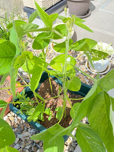 白くて小さな花が咲きはじめました。初めて大豆の花を見て、そのかわいらしさに家族もとても喜びの声をあげています。育て方ブックのとおり、たくさんの花がこれから咲いてくれることを楽しみに、観察を続けていきたいと思います。