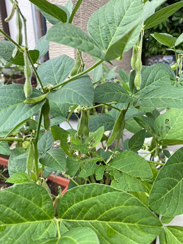 花が咲き終わって、枝豆がなり始めました。最初は実がうすい(?)小さい状態だったので、どうなっていくのか、このままなのか気がかりでした。しかし、日が経つにつれて実がふっくらとふくらんで大きくなってきたので、毎日楽しみに観察しています。ただ、毛虫が葉っぱを食べるようになって困っています。退治しつつ、葉っぱを維持していますが、毛虫の数がかなりいる!! 大豆に無事なってもらいたい!1つでも多くと思っています。