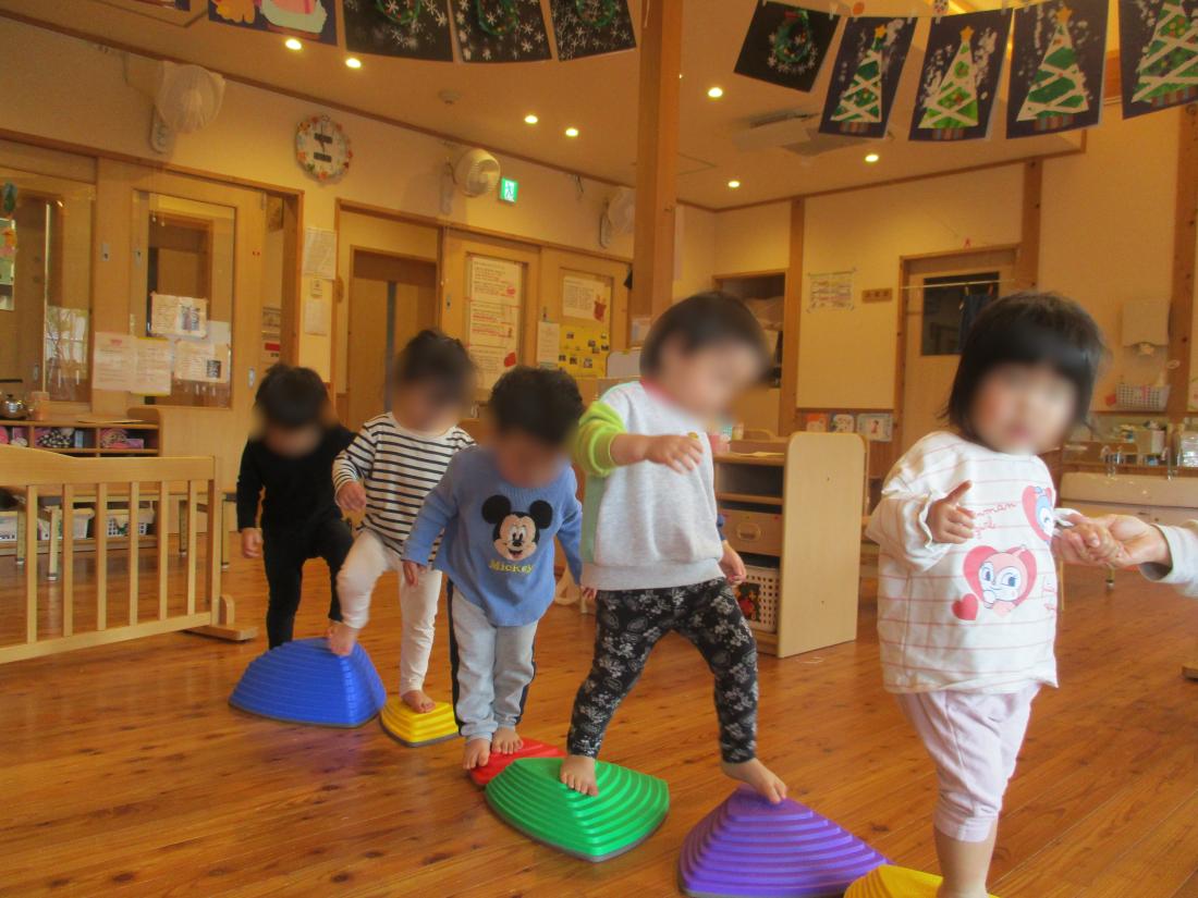 早速遊んでみた子どもたちですが、上手にバランスを取りながらブロックの上を歩いたり、