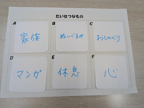自分にとって大切なものを6つ書いてもらい、それが失われた時の気持ちを皆さんに疑似体験してもらうことで、日々の平和の大切や平和を守るために自分なりに何ができるかを考えてもらいました。