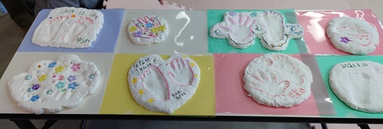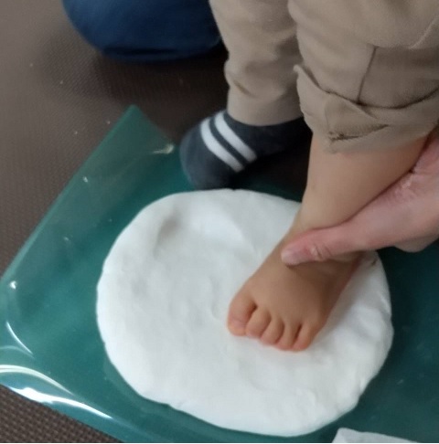 季節にあった活動を楽しむ子育てサークルです。なかよくおしゃべりママ友を作ろう!紙粘土を使って、お子さんの手形、足形を作りましょう。1年でこんなに大きくなりました。お子さんと共同での制作活動を楽しんでください。