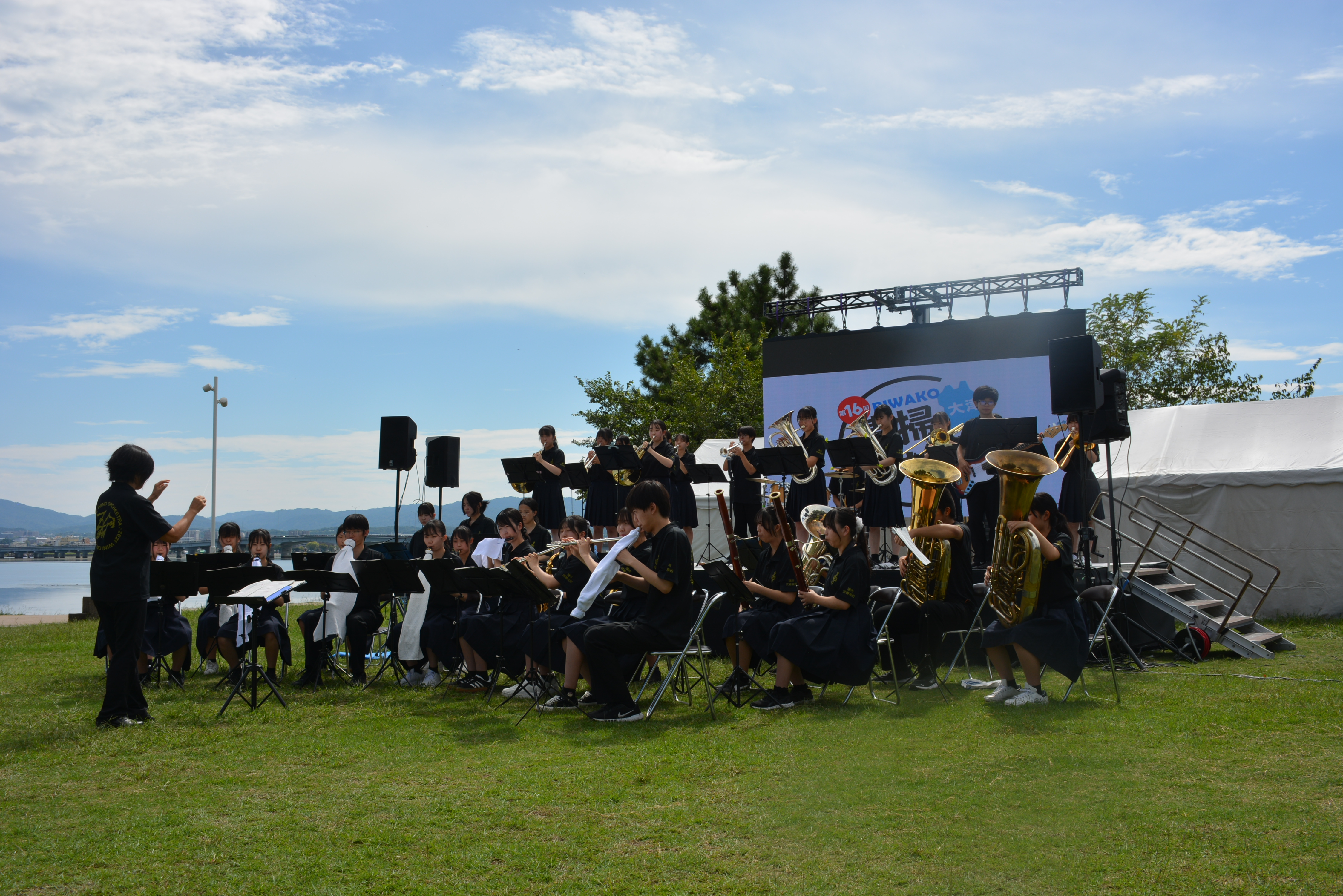清掃ウォークを終えた参加者は、県立膳所高等学校吹奏楽班の演奏とびわ湖や滋賀県に関するお楽しみクイズ大会を満喫しました。クイズの正解者には、びわ湖に関係する商品やコープ商品をセットでプレゼントされました。