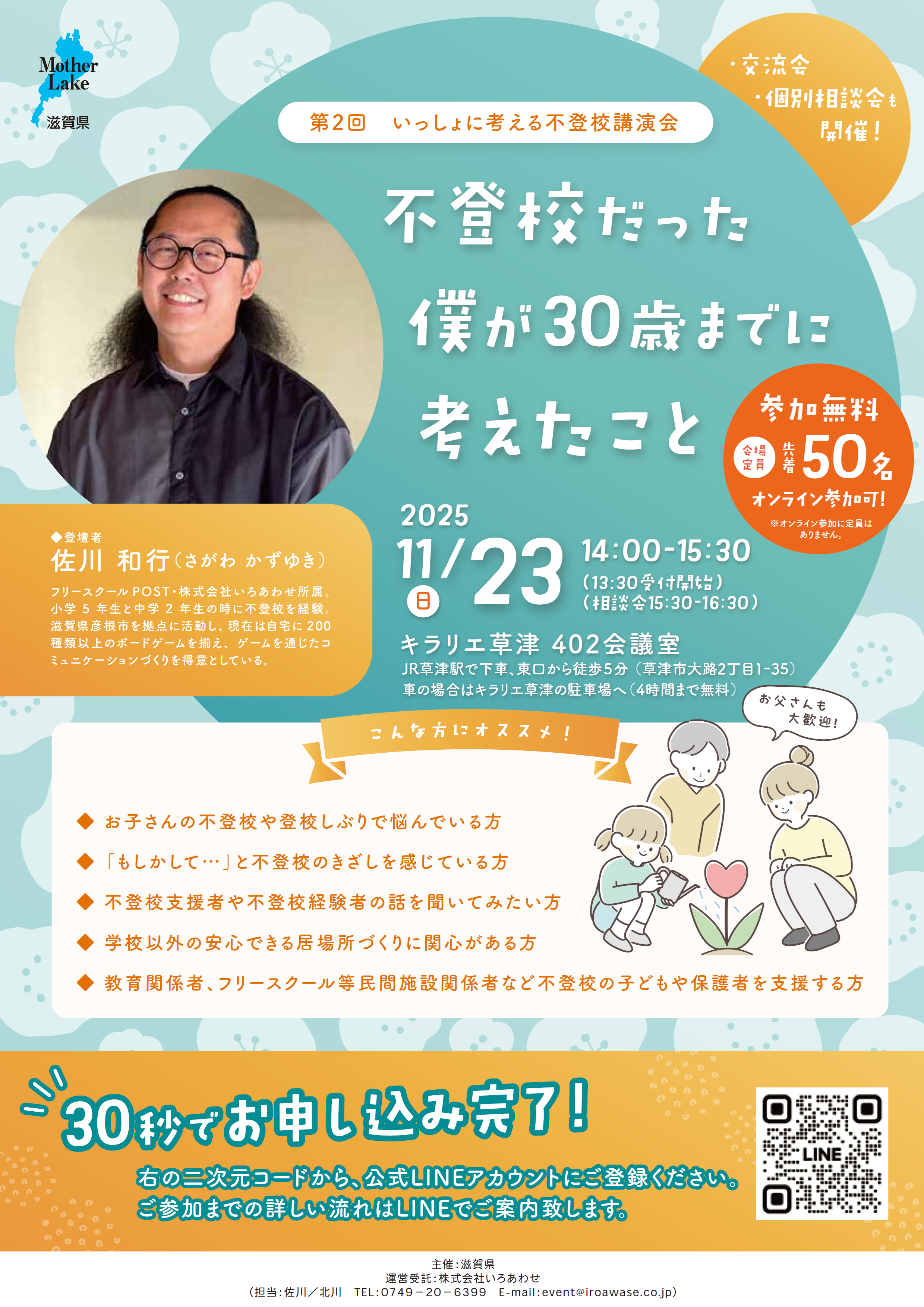【滋賀県からのお知らせ】第2回いっしょに考える不登校講演会