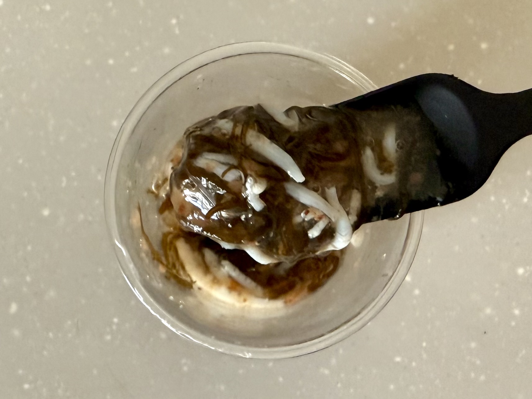 交流会後は、「もずくを楽しもう!イベント」としてコープぜぜ店で、もずくの試食イベントを行いました。店内でも、もずくの食べ比べと人気投票・アレンジレシピの試食が行われました。人気投票では、シークヮーサー味の得票数が多く、試食を機に購入される組合員も多くおられました。アレンジレシピ「フルーツカクテル」では、意外な組み合わせに驚かれながらも「おいしい!さわやかで合う!」というお声が多くあり、その日お店を訪れた組合員の方々はもずくを存分に楽しみました。