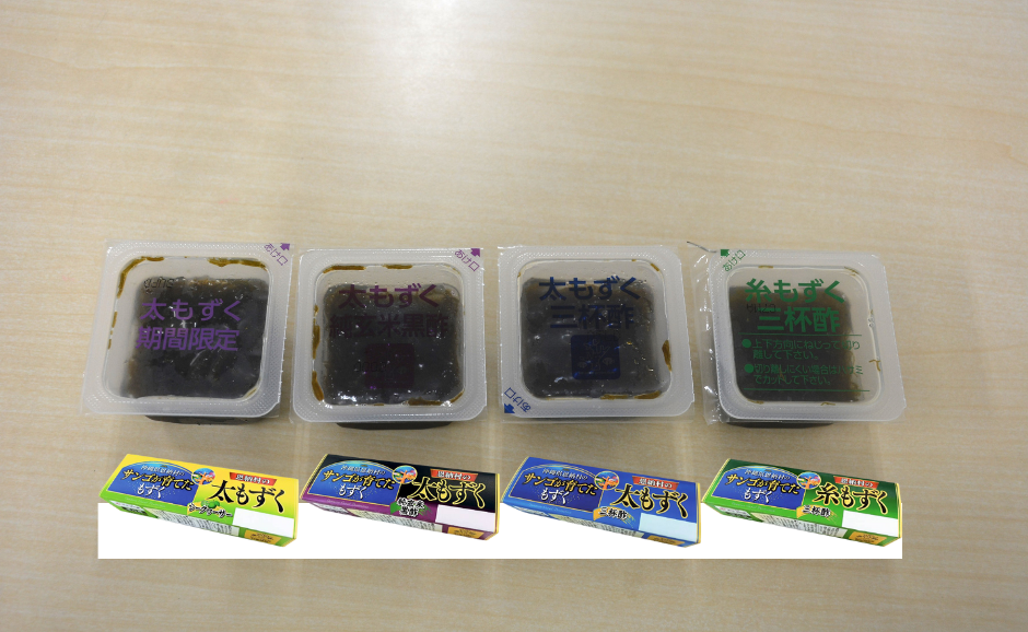 学習と体験の後は、もずくの食べ比べとアレンジレシピの試食が行われました。現在、宅配でもお店でも取り扱っている、「沖縄県恩納村のサンゴが育てた太もずくシークヮーサー/純玄米黒酢/三杯酢」「沖縄県恩納村のサンゴが育てた糸もずく三杯酢」の4種類を食べ比べ。好きな商品に投票しました。