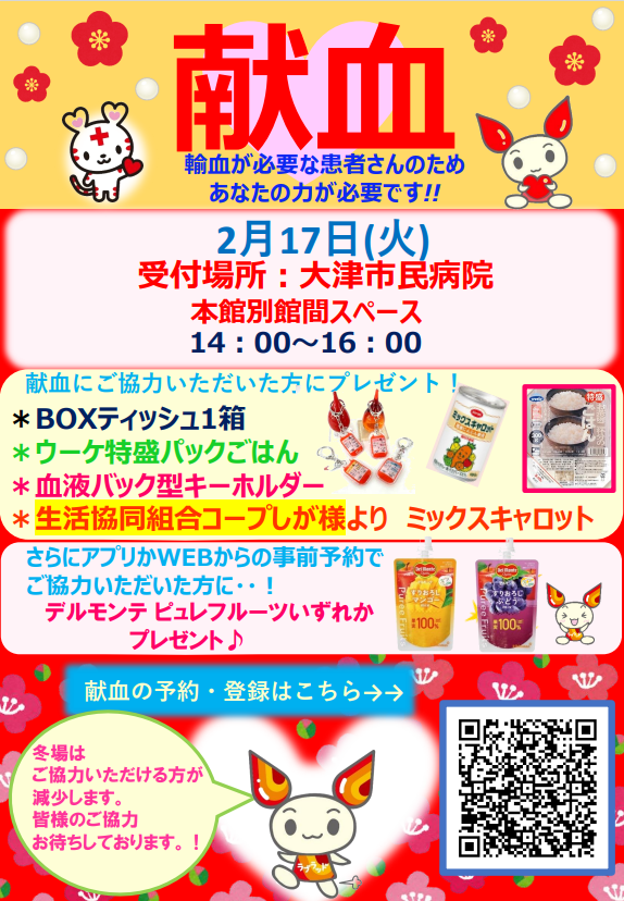 【滋賀県赤十字社血液センターより】献血のお知らせ(2/17 市立大津市民病院)