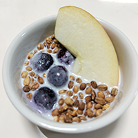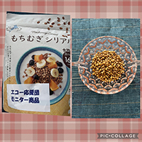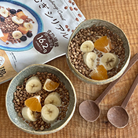 トマト入りスープパスタにトッピングしました。トマトの酸味に、もちむぎシリアルの香ばしさと食感がマッチして新感覚のメニュー誕生です。他には、ヨーグルトによく合います。
