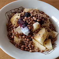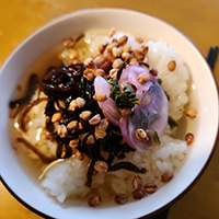 朝食には、前日の残りご飯をお茶漬けにした時に、あられの代わりにオン。ちょうど良い食感でおいしかった。味もついてないので、昆布、梅干し、日野菜の浅漬けと一緒に食べても味の邪魔をしなくて良かったです。 おやつには、定番のヨーグルトにオン。こちらは、歯ごたえがあり、噛むことで満足に感じました。