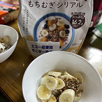 香ばしさと食感がとてもいい感じでした。夫は、血糖値が高いので、健康面からもちむぎシリアルはいいのかなと思っています。