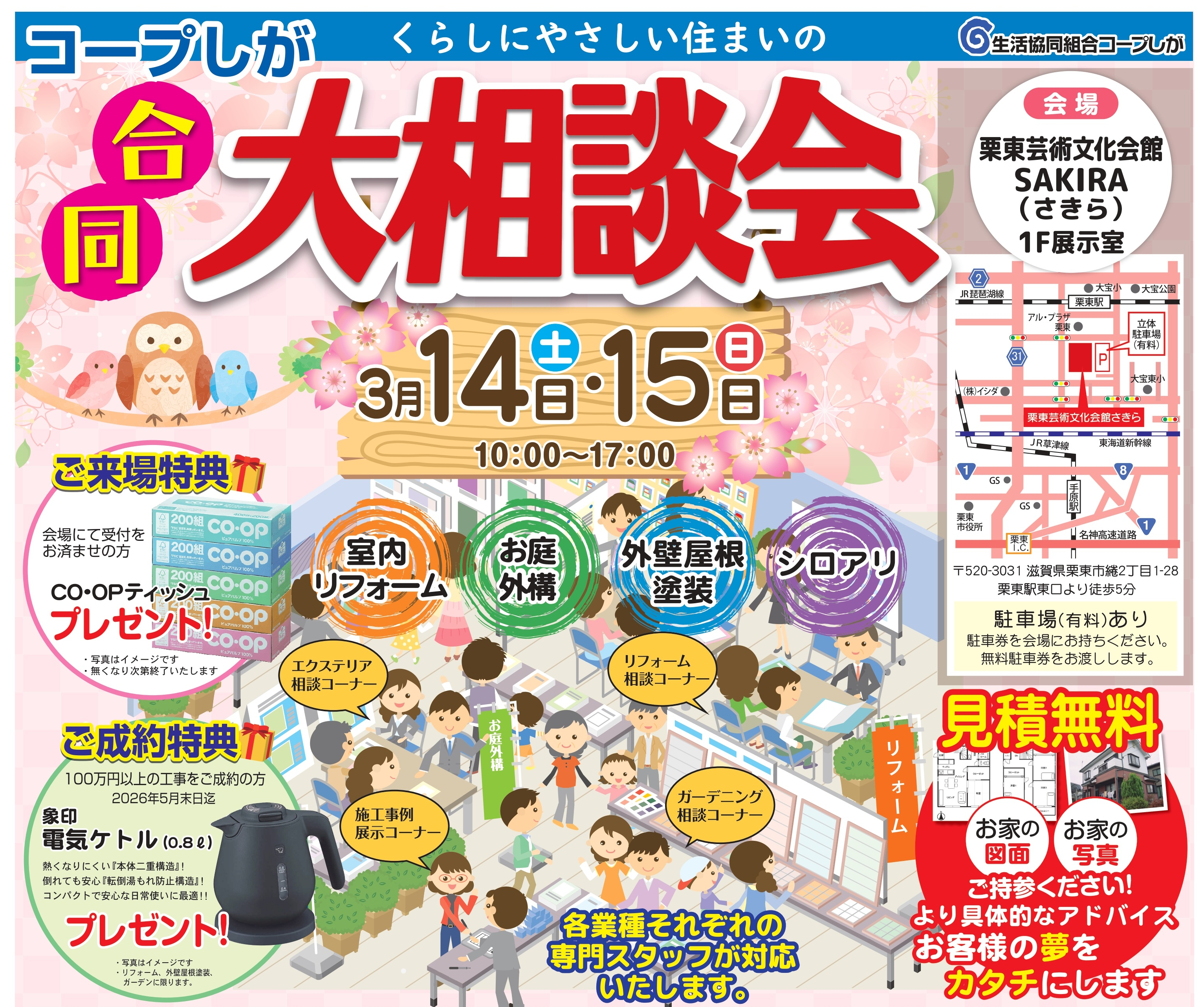 3月14日(土)・15日(日)10時~17時の二日間、「栗東芸術文化会館さきら」にて開催します。コープしがの組合員、またはそのご家族であればどなたでもご来場いただけます!